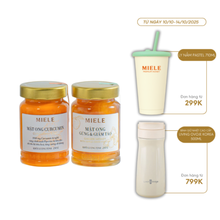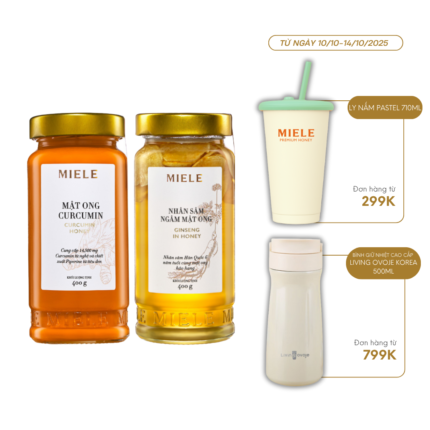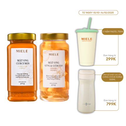 COMBO SIÊU ĐỀ KHÁNG: MẬT ONG CURCUMIN MIELE 400G + MẬT ONG GỪNG & GIẤM TÁO MIELE 400G*𝐌𝐚̣̂𝐭 𝐨𝐧𝐠 𝐂𝐮𝐫𝐜𝐮𝐦𝐢𝐧 𝐌𝐢𝐞𝐥𝐞 chứa thành phần chính Curcumin từ nghệ và Piperine từ tiêu đen giúp hỗ trợ dạ dày, cải thiện hệ tiêu hóa.