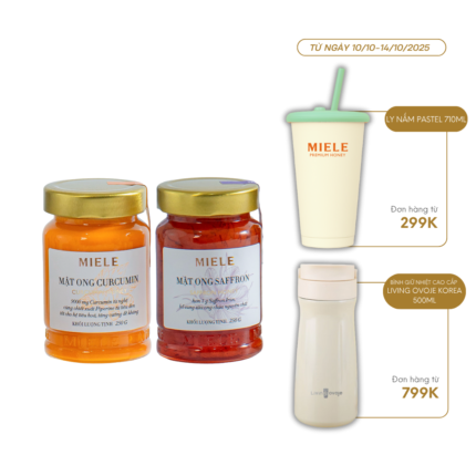 COMBO: MẬT ONG CURCUMIN MIELE 400G + MẬT ONG SAFFRON MIELE 400G*𝐌𝐚̣̂𝐭 𝐨𝐧𝐠 𝐂𝐮𝐫𝐜𝐮𝐦𝐢𝐧 𝐌𝐢𝐞𝐥𝐞 chứa thành phần chính Curcumin từ nghệ và Piperine từ tiêu đen đem đến những lợi ích cho tiêu hoá (đặc biệt là dạ dày), hệ hô hấp và sức đề kháng