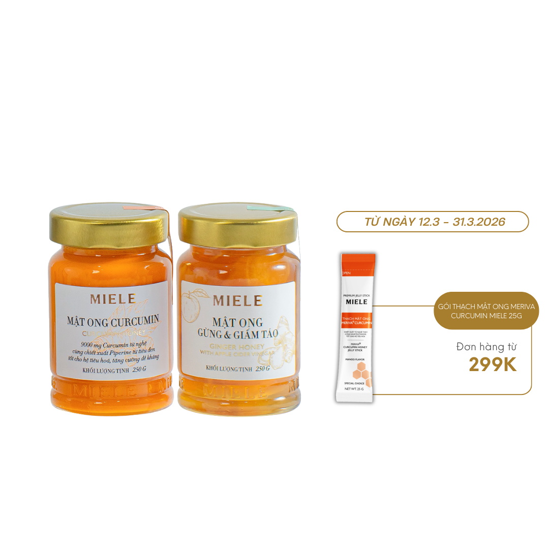 COMBO SIÊU ĐỀ KHÁNG: MẬT ONG CURCUMIN MIELE 400G + MẬT ONG GỪNG & GIẤM TÁO MIELE 400G*𝐌𝐚̣̂𝐭 𝐨𝐧𝐠 𝐂𝐮𝐫𝐜𝐮𝐦𝐢𝐧 𝐌𝐢𝐞𝐥𝐞 chứa thành phần chính Curcumin từ nghệ và Piperine từ tiêu đen giúp hỗ trợ dạ dày, cải thiện hệ tiêu hóa. *𝐌𝐚̣̂𝐭 𝐨𝐧𝐠 𝐆𝐮̛̀𝐧𝐠 & 𝐆𝐢𝐚̂́𝐦 𝐓𝐚́𝐨 𝐌𝐢𝐞𝐥𝐞 với thành phần chính hoàn toàn từ gừng tươi, bổ sung thêm giấm táo hữu cơ giúp tăng cường đề kháng, cải thiện các vấn đề về hô hấp, thanh lọc và giải nhiệt cơ thể hiệu quả.