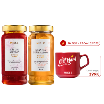 COMBO: MẬT ONG SAFFRON MIELE 400G + MẬT ONG NHÂN SÂM MIELE 400G*𝐌𝐚̣̂𝐭 𝐨𝐧𝐠 𝐒𝐚𝐟𝐟𝐫𝐨𝐧 𝐌𝐢𝐞𝐥𝐞 với thành phần gồm mật ong hoa sú (loài cây mọc tự nhiên miền biển) kết hợp cùng Saffron loại 1 được nhập khẩu chính ngạch từ Iran và bổ sung sữa ong chúa cao cấp.*𝐌𝐚̣̂𝐭 𝐨𝐧𝐠 𝐍𝐡𝐚̂𝐧 𝐬𝐚̂𝐦 𝐌𝐢𝐞𝐥𝐞 với thành phần gồm mật ong hoa sú (loài cây mọc tự nhiên miền biển) kết hợp cùng nhân sâm Hàn Quốc 6 năm tuổi và bổ sung sữa ong chúa cao cấp.