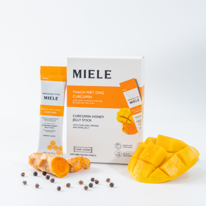 • Thạch Mật ong Curcumin Miele – Với thành phần giữ trọn công thức mật ong hoa nhãn + bộ đôi vàng cho hệ tiêu hóa “Hoạt chất Curcumin & Piperine” và đặc biệt bổ sung thêm Sữa ong chúa cao cấp